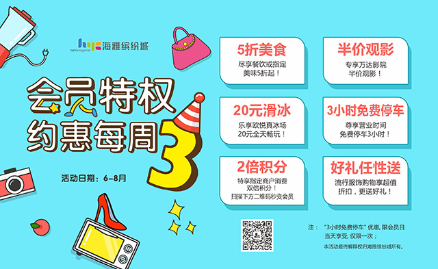 近日,海雅缤纷城启动“周三会员日”活动,联合400多家场内品牌商铺推出免费、半价、2倍积分等优惠,涵盖餐饮、服饰、娱乐配套等众多品类。顾客只要成为海雅缤纷城会员,6月至8月期间每逢周三即可享受会员特权。