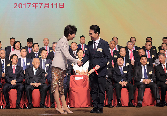 香港特区行政长官林郑月娥为全国政协委员、海雅集团董事局主席涂辉龙颁发首席会长证书