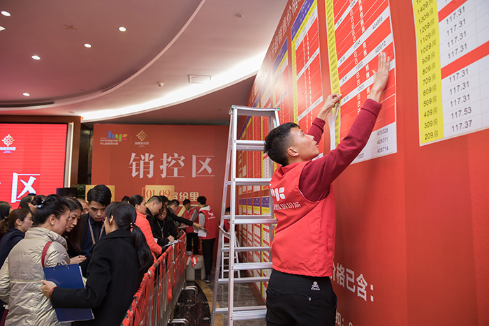 随后,主持人一声“选房正式开始”将现场的抢房紧张气氛推向高潮。外场摇号大屏幕上的数字不断翻动,内场选房区喊控声此起彼伏,一批批客户有条不紊地进入内场选房,喜气洋洋地出来,在等候区排队的客户心急如焚,不断与自己的置业顾问联系询问内场情况,生怕自己心仪的房子被别人抢先选走了。