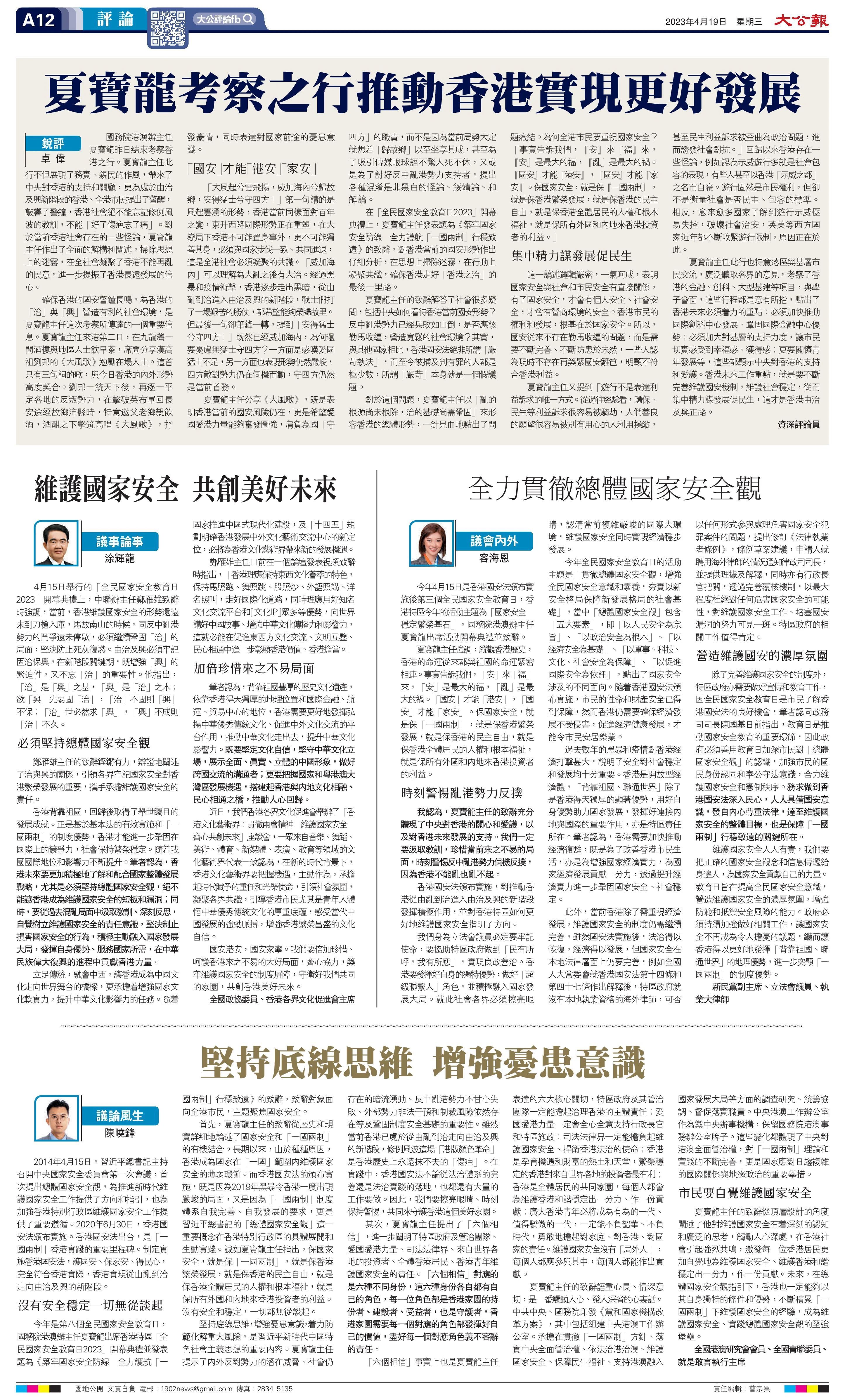 香港特别行政区维护国家安全委员会主办的“全民国家安全教育日2023”开幕典礼15日在香港举行。全国政协委员、香港各界文化促进会主席、海雅集团董事局主席涂辉龙博士撰文指出:香港未来要更加积极地了解和配合国家整体发展战略,尤其是必须坚持总体国家安全观,绝不能让香港成为维护国家安全的短板和漏洞;同时,要从过去混乱局面中汲取教训、深刻反思,自觉树立维护国家安全的责任意识,坚决制止损害国家安全的行为。